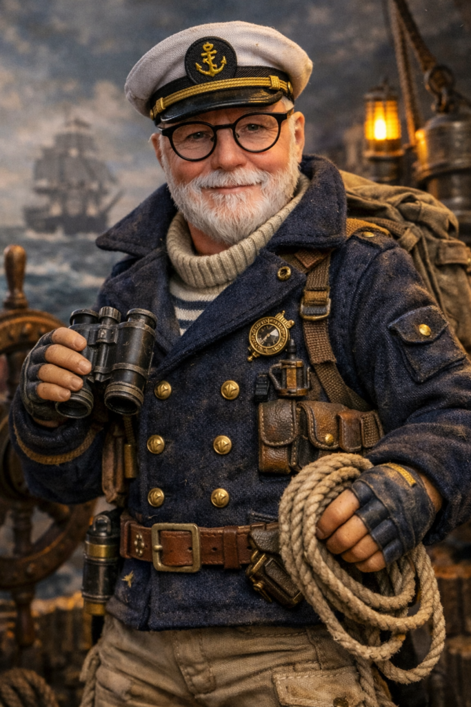 Als ich vor sechs Jahrzehnten mit dem Segeln begann, da konnten wir uns nicht vorstellen, dass so etwas technisch mal möglich sein würde. Allein zwei, drei Begriffe und ein Konterfei reichen, um so eine Gestalt werden zu lassen. Na ja, war halt ein Spaß. Und mit dem Ausnahme des Fernglases und dem Ende Tauwerk trägt der KI-Kommodore ja nicht wirklich viel Seefahrt-Taugliches mit sich herum. Mir ist die Automatikweste lieber als das Ledergurtzeug und eine andere Mütze trage ich auch. Meist einen Elbsegler, neuerdings aber nach Verlust desselben einen „Eckernförder“. In Eckernförde entdeckt und nur dort in Handarbeit gefertigt. Ähnlich wie Elbsegler, aber etwas breiter.